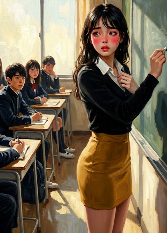 担任教師の弱みを握った二人は、危険な挑発行為を仕掛けて、里穂を揺さぶった。最後尾の列に座った二人は、ほんの数分前に奪ったばかりのパンティをわざとらしくヒラヒラと振り回したり、匂いを嗅いでみせたりする。そうして、里穂が教壇の上で青ざめる様を愉しんでいる。もちろん里穂はそれを注意することもできない。ただ、周りの生徒の目に気づかれることがないよう、祈ることしかできないのだ。